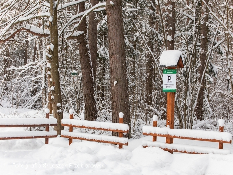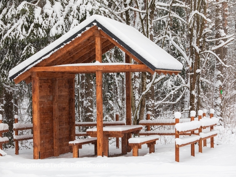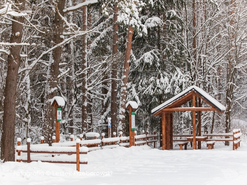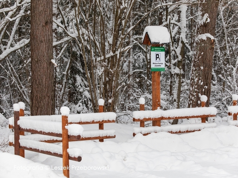 W części leśnego parkingu znajduje się drewniana wiata z dwuspadowym dachem, pod którą stoi masywny, ośnieżony stół z ławami, zapraszający do krótkiego postoju z termosem gorącej herbaty, pozwalający w pełni kontemplować surowe, zimowe piękno lasu. Jedynie dwie tablice informacyjne, oblepione śniegiem przypominają o cywilizacji. Granice polany wyznaczają wysokie świerki i sosny o gałęziach uginających się pod ciężarem białego puchu, tworząc naturalną barierę chroniącą przed wiatrem.