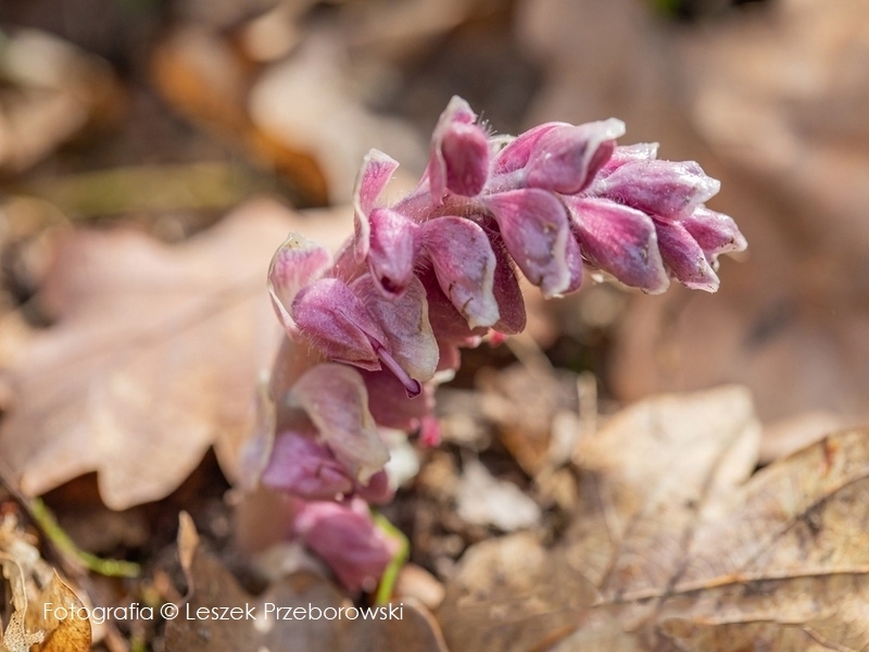 Podziemne kłącze może ważyć nawet 5 kg i sięgać 1 metra głębokości. Jego pędy, łuski i kwiaty są zazwyczaj bladoróżowe, cieliste lub fioletowawe. Kwiat jest zebrany w gęste, jednostronne grono, które na początku jest zwisające, a później się prostuje. Roślina osiąga wysokość 10-30 cm. Za pomocą specjalnych ssawek pobiera wodę, sole mineralne i substancje organiczne z korzeni gospodarzy: najczęściej buków, grabów, dębów, a czasem świerków.